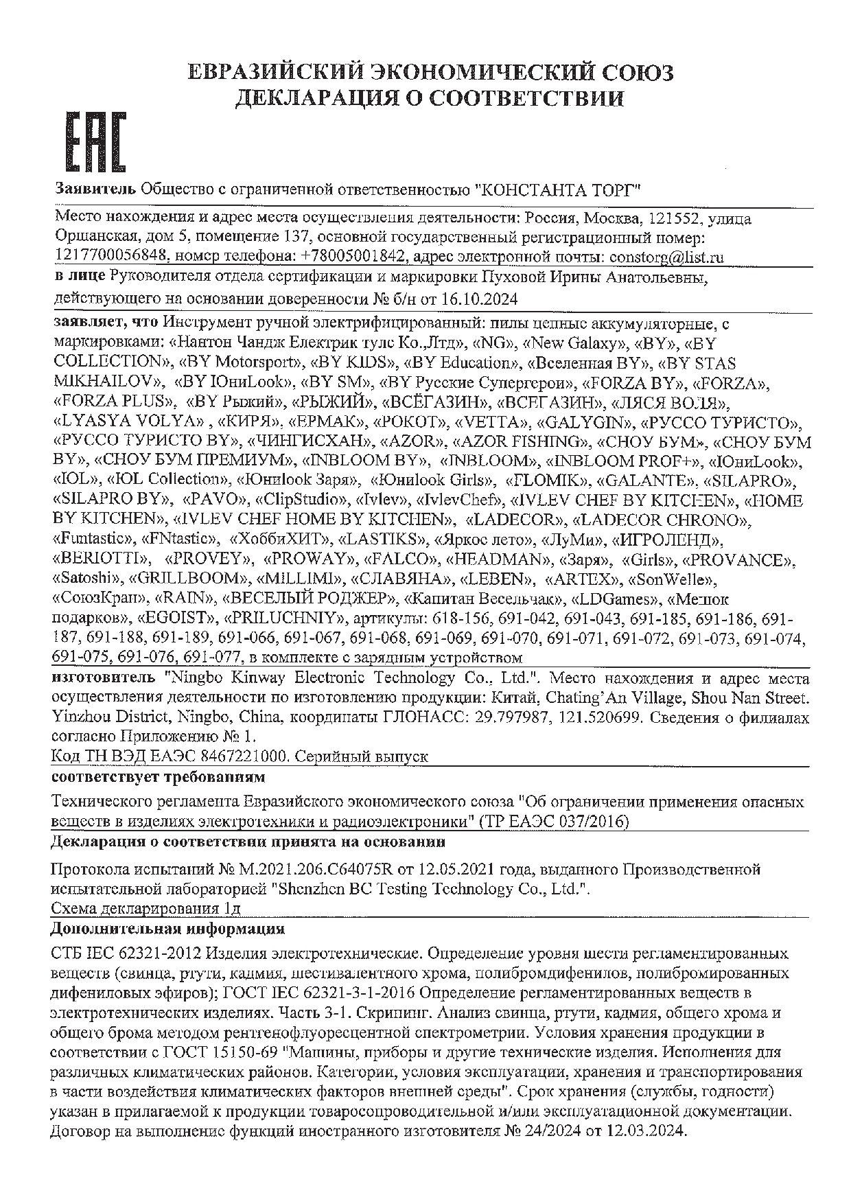 ЕРМАК Пила цепная аккум., ПЦА-20В, 150 мм, 2.0 А*ч Li-ion, 5м/с, ЗУ (ONE)